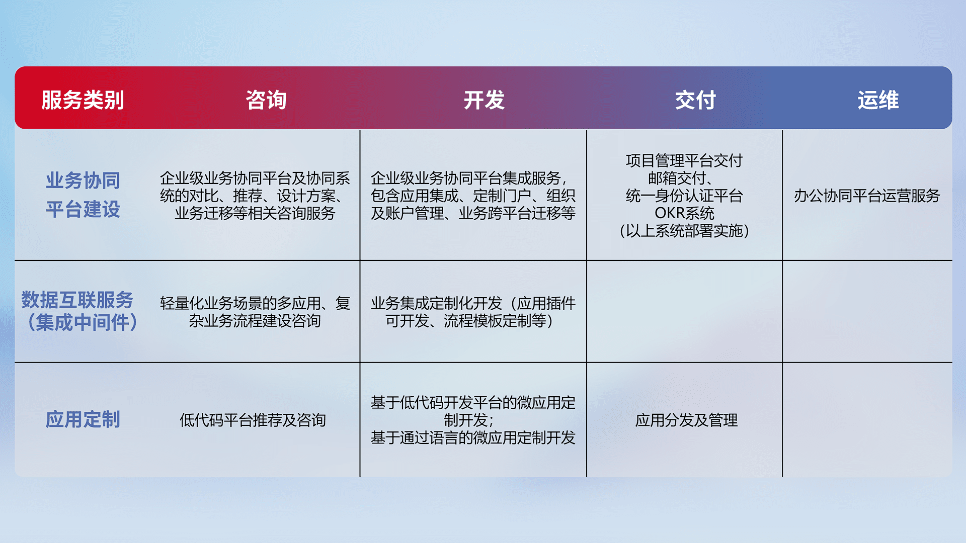 针对钉钉、、企微、、、、IDaas等平台级产品提供产品的规划、、、方案、、、交付、、、、定制化开发等服务,,,实现如统一协同办公、、、智能客户服务、、、、混合会议管理、、智能数据查询、、、、等业务场景,,实现数字化转型。。。。